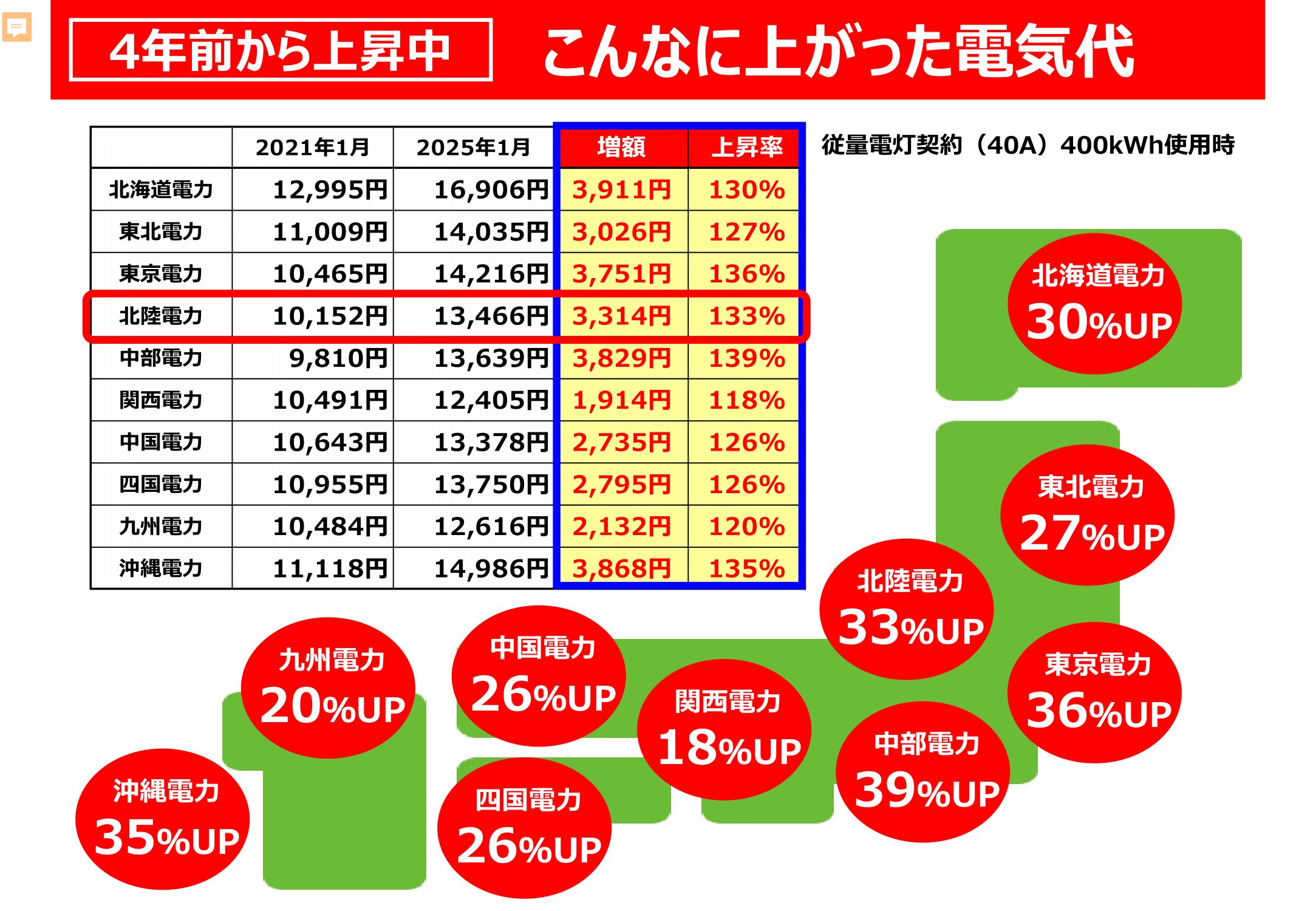 実際、直近4年の間に各主要電力会社による料金改定が行われており、全国各地で電気代が20~30%程度上昇しています。